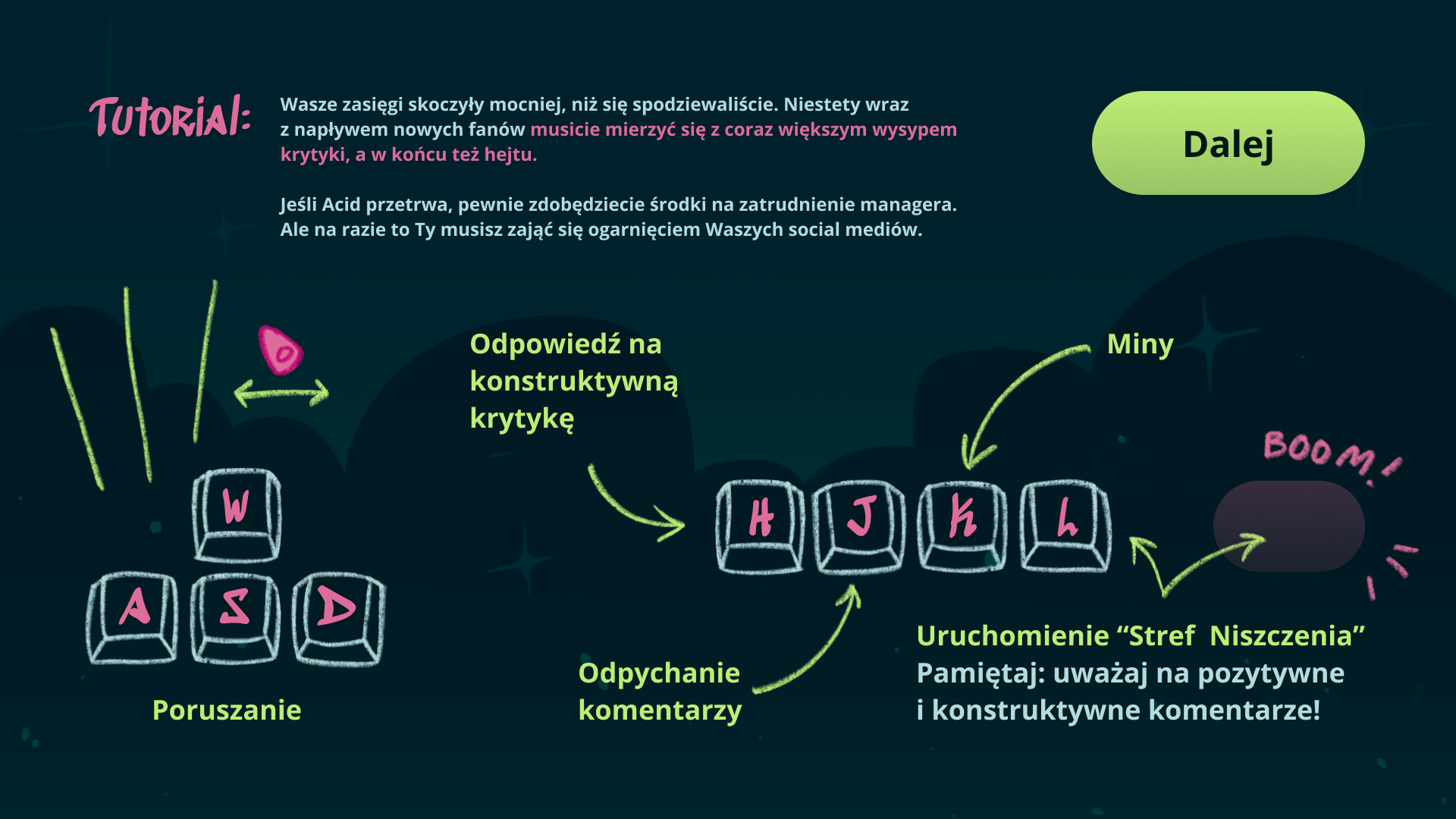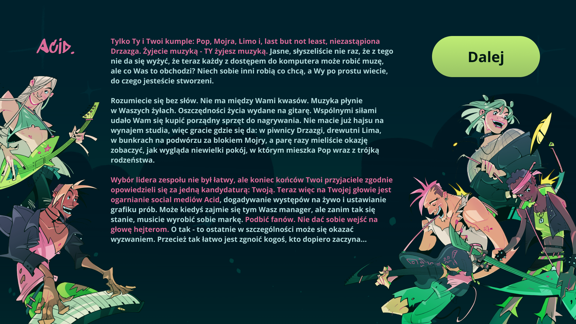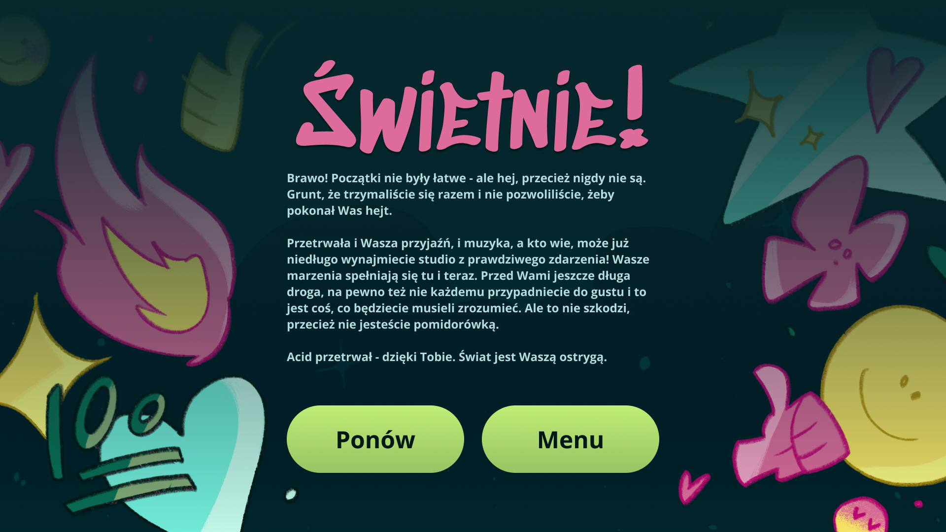 Czy zareagujesz dostatecznie szybko, żeby fala hejtu nie odbiła się na Waszych wzajemnych relacjach? Spróbuj swoich sił i spraw, żeby Acid nie utraciło rytmu ani wiary w siebie!
